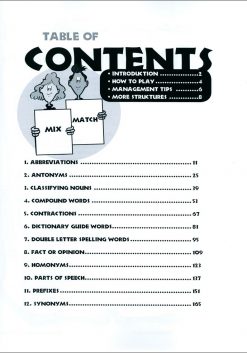 Transform you English lessons into proven energising activities students love. Students each get a Mix-N-Match card related to the topic. They move about the room quizzing each other and trading Mix-N-Match cards. You call, “Freeze!” They then rush to find a partner with the matching card. “Does your word fit between my dictionary guide words?” “What part of speech is my word?” Students enjoy mixing and matching so much, they hardly realise they are repeatedly quizzing each other and mastering the content. Book includes reproducible Mix-N-Match card sets for: Abbreviations, antonyms, classifying nouns, contractions, dictionary guide words, double letter spelling words, fact and opinion, homonyms, parts of speech, prefixes and synonyms. 208 pages